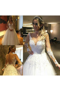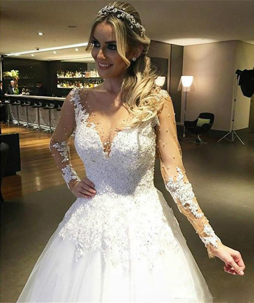 Illusion Deep V Neck Pearls Beaded Backless Sheer See Through Lace Wedding Dress-715332