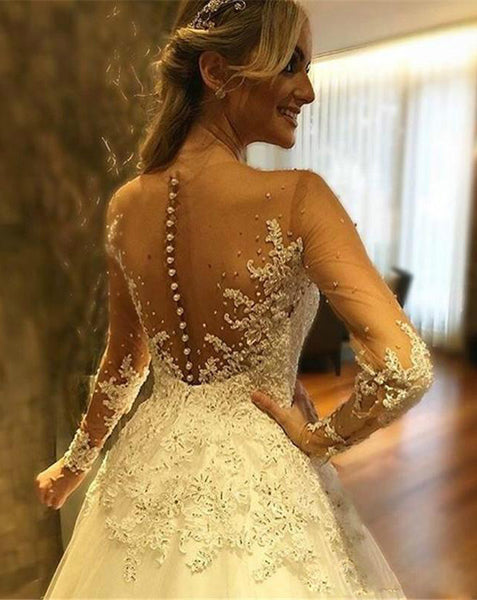 Illusion Deep V Neck Pearls Beaded Backless Sheer See Through Lace Wedding Dress