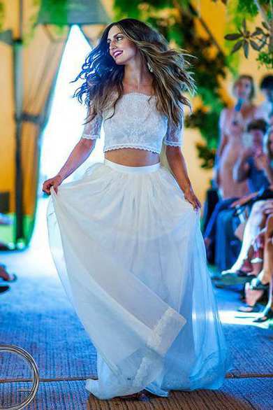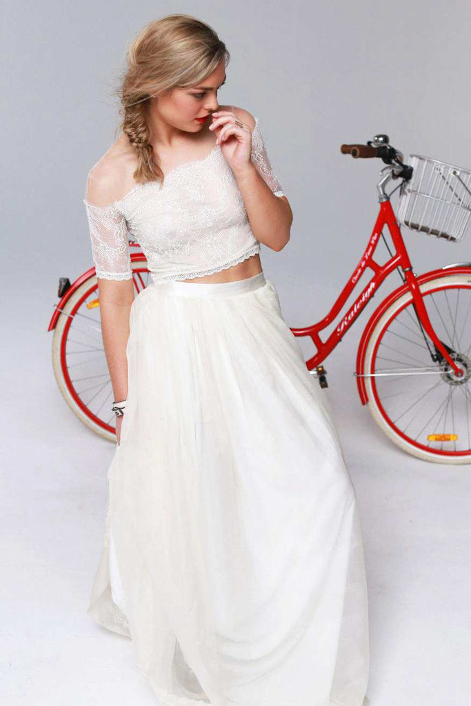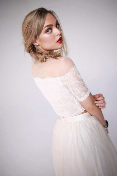 Illusion Off-The-Shoulder Lace Short Sleeve Two Piece Wedding Dress-715298