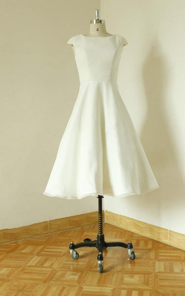 Jewel Cap Sleeve Zipper Back Tea-Length Satin Wedding Dress-711072