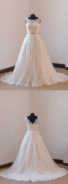 Lace A-Line Sleeveless Wedding Gown With Low-V Back and Beaded Sash-ET_711627