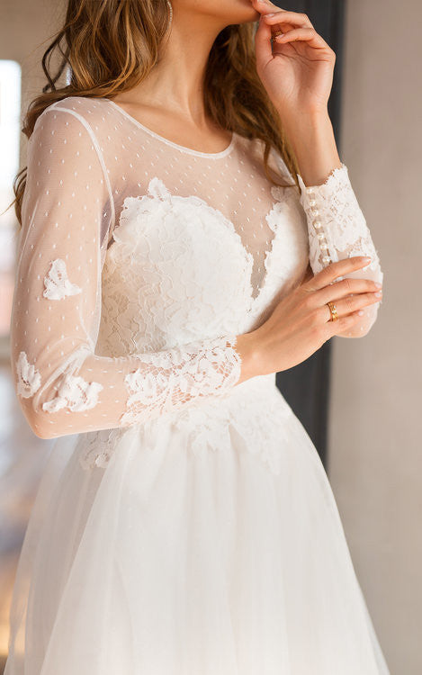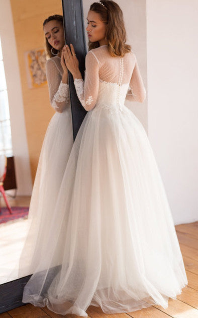 Lace Tulle Floor-length A Line Long Sleeve Modest Wedding Dress with Beading-716014