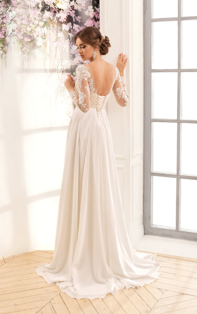 Long-Sleeve Appliqued Pleats Floor-Length A-Line Lace Dress-714440