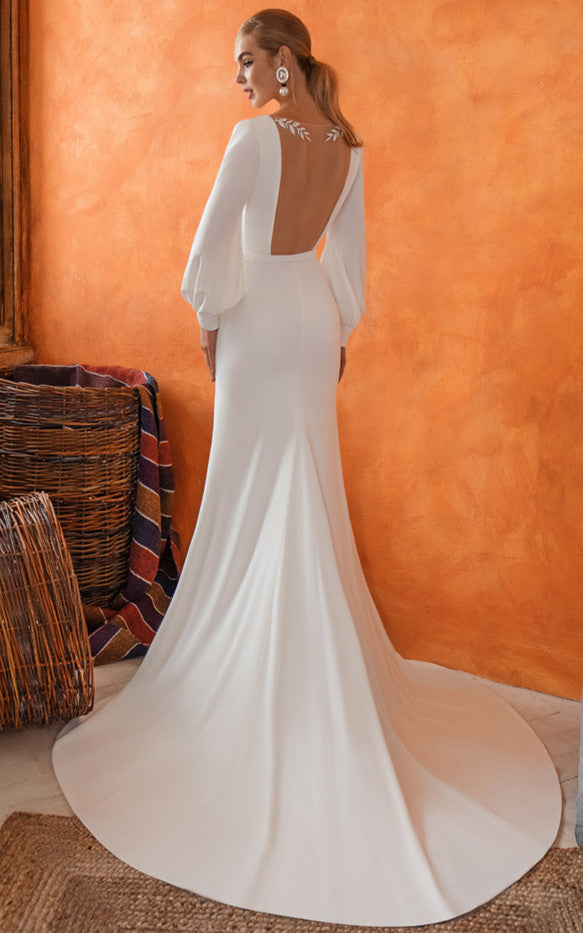 Long Sleeved Simple Mermaid V-neck Chiffon Satin Wedding Dress