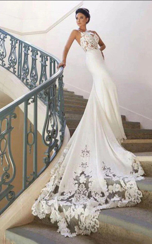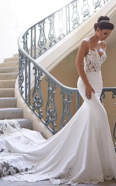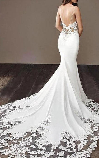 The Bohemian Mermaid Lace V-neck Satin Spaghetti Garden Wedding Dress Simple Casual Elegant Romantic With Open Back And Appliques-716796 destined to impress, and priced at only $238.99, for a limited time.
