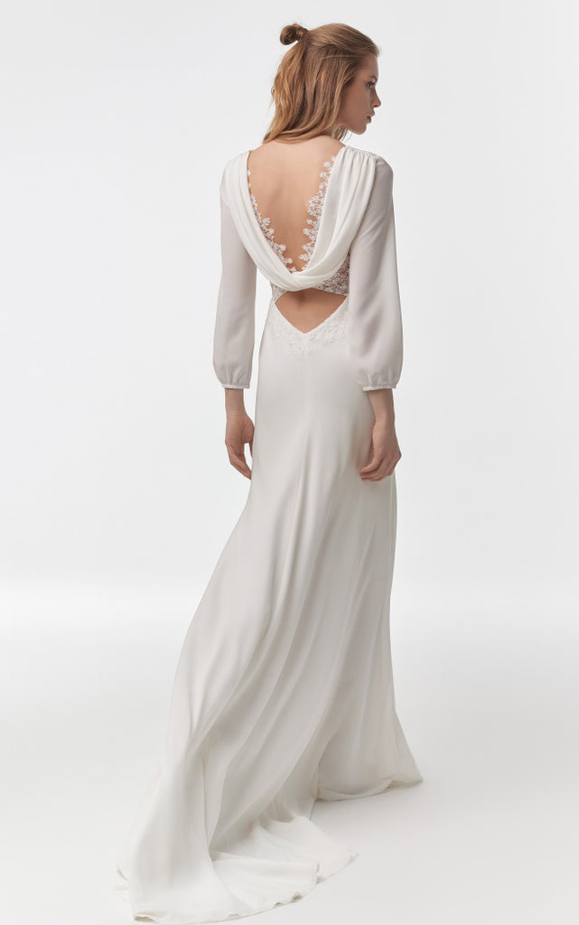 The Modern Chiffon V-neck Sheath Long Sleeve Wedding Dress with Open Cowel Back and Sweep Train-715907 is the yin, to your yang. You've found what you're looking for.