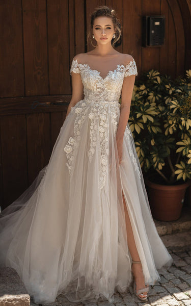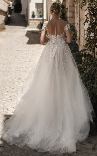 Modern Tulle Off-the-shoulder Short Sleeve Appliques Wedding Dress With Button-716169
