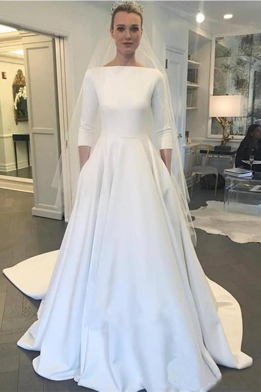 Modest Satin A-Line 3/4 Long Sleeve Wedding Dress With Full Covered Back and Pockets-715740