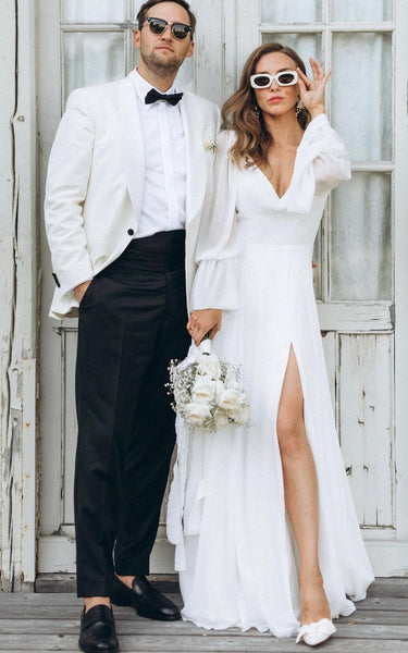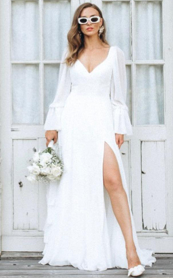 Modest Solid White A-Line Split Front Wedding Dress Elegant Simple Casual Long Sleeves V-Neck Bridal Gown