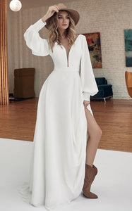 Backless Long Sleeve Hippie V-neck A Line Chiffon Sweep Train Wedding Dress-716044