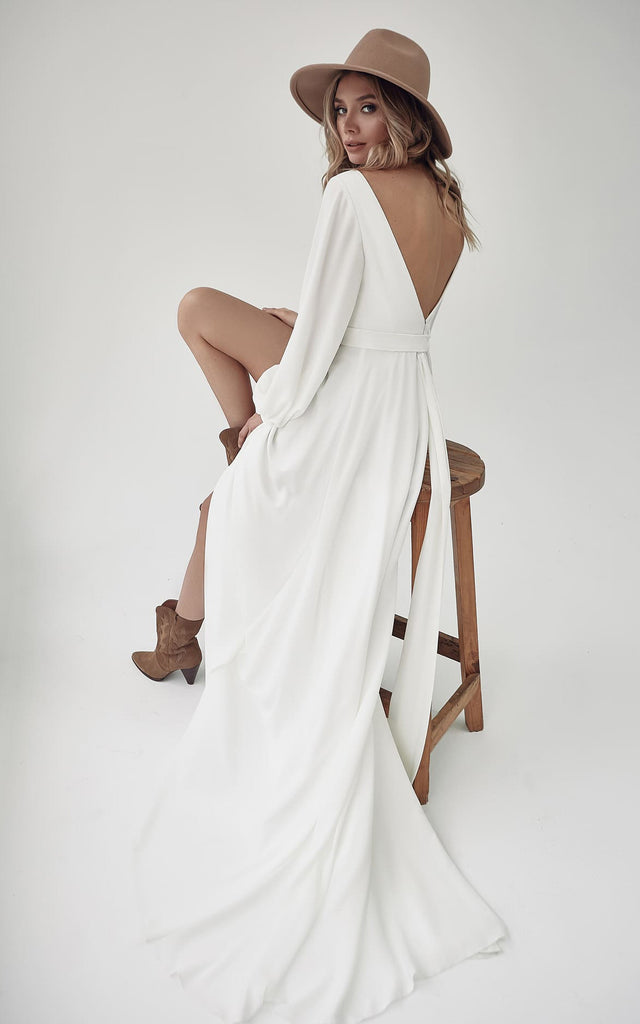 The Backless Long Sleeve Hippie V-neck A Line Chiffon Sweep Train Wedding Dress-716044 is evocative, to say the least, but that's why you're drawn to it in the first place.
