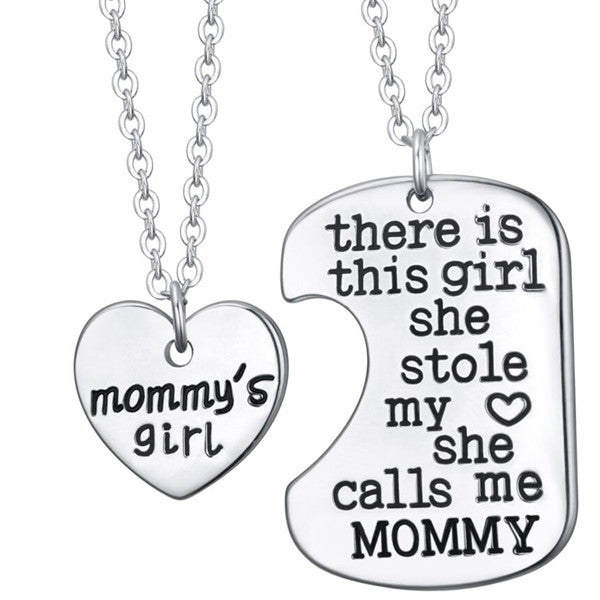 Are you the missing link in your daughter's heart? If you love your daughter as much as we love ours, let her know with this special charm necklace set! Its custom engraving "There is this girl she stole my heart she calls me mommy" and matching heart to interlock with "Mommy's Girl" engraved will have your daughter boasting to all her friends. She will never want leave home without it.