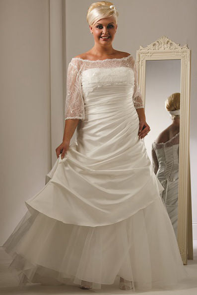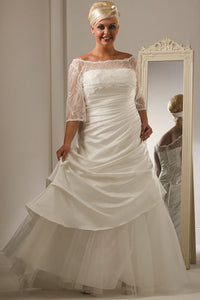 Off Shoulder Lace Half Sleeve Taffeta Bridal Gown With Tulle Skirt-MK_703731