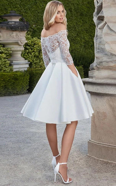 The Off-the-shoulder A Line Satin Knee-length Wedding Dress with Sash-716089 destined to impress, and priced at only $138.99, for a limited time.