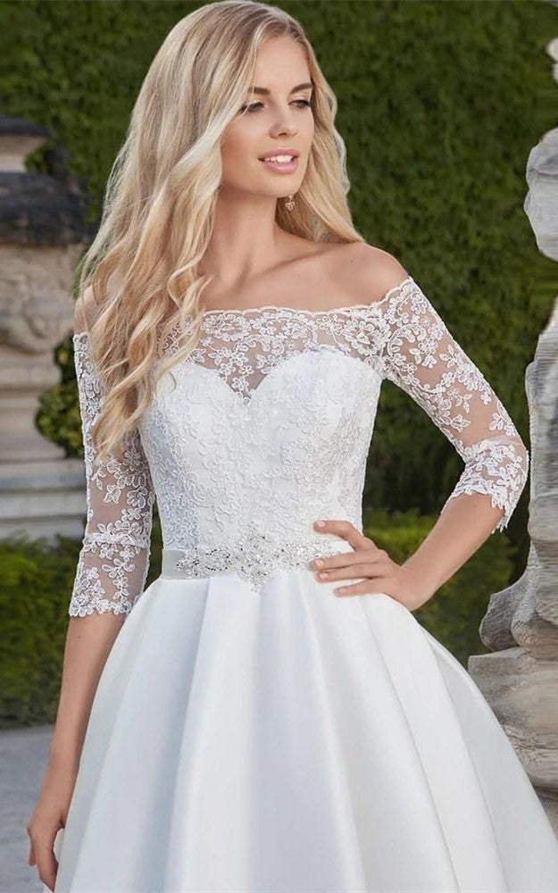Off-the-shoulder A Line Satin Knee-length Wedding Dress with Sash-716089