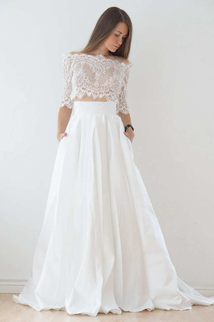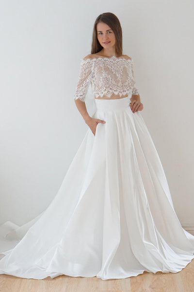 Off-The-Shoulder Lace A-Line Satin Two-Piece Wedding Dress With Sweep Train