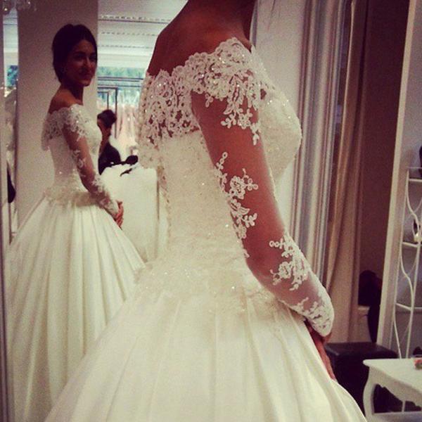 The Off-the-shoulder Long Sleeve Pleated Satin Ball Gown With Lace-up and Beaded Detailing-BU_708749 is evocative, to say the least, but that's why you're drawn to it in the first place.