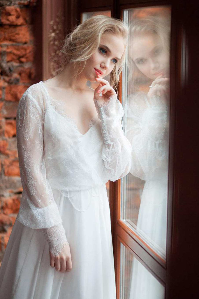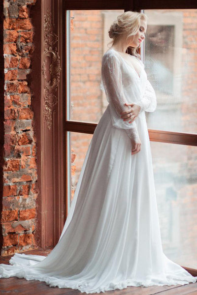 Plunged Lace Illusion Long Puff Sleeve Chiffon Wedding Dress With Sweep Train-714870