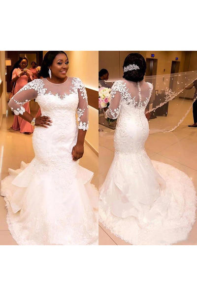 Plus Size Sheer 3-4 Long Sleeves Lace Mermaid Wedding Dress-715408