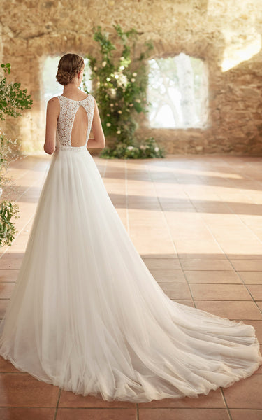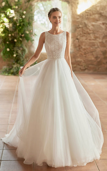 Princess Modest A-Line Boho Lace Tulle Ballgown Wedding Dress Ethereal Church Sleeveless Bateau Neck Floor Length Bridal Gown with Train