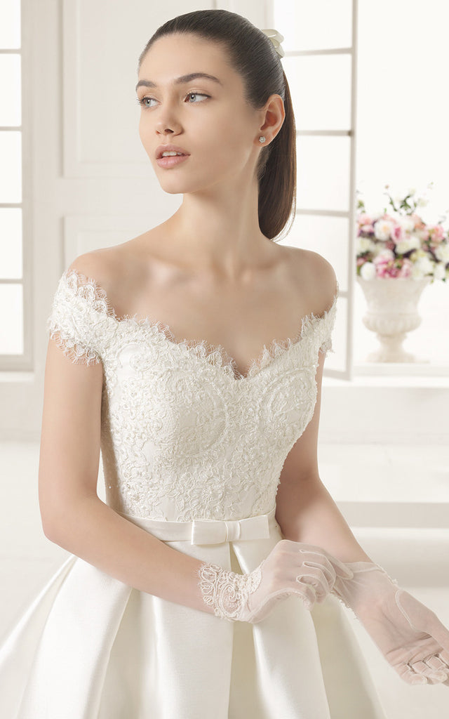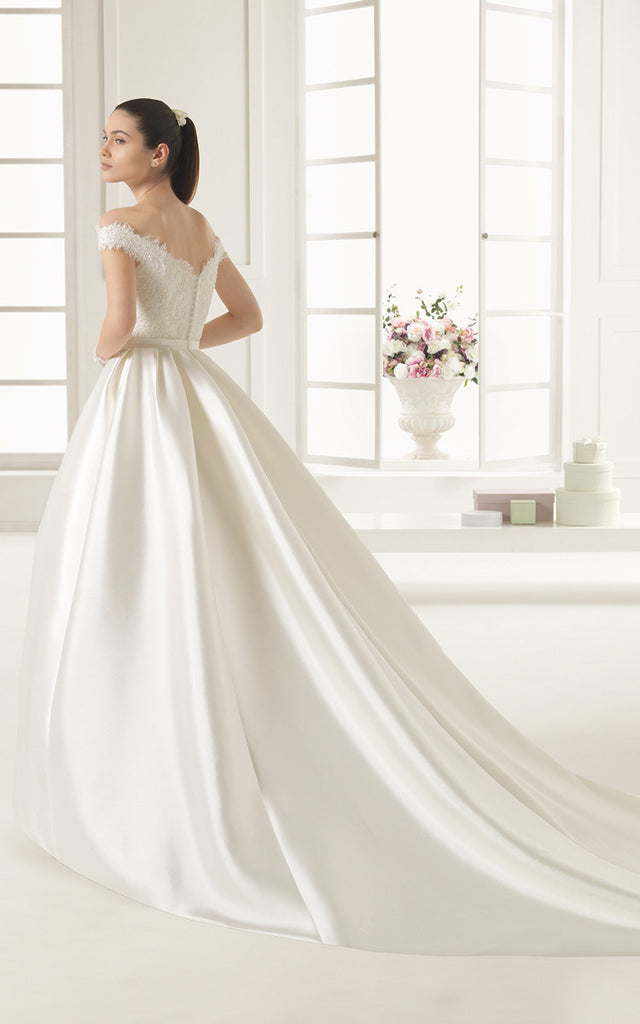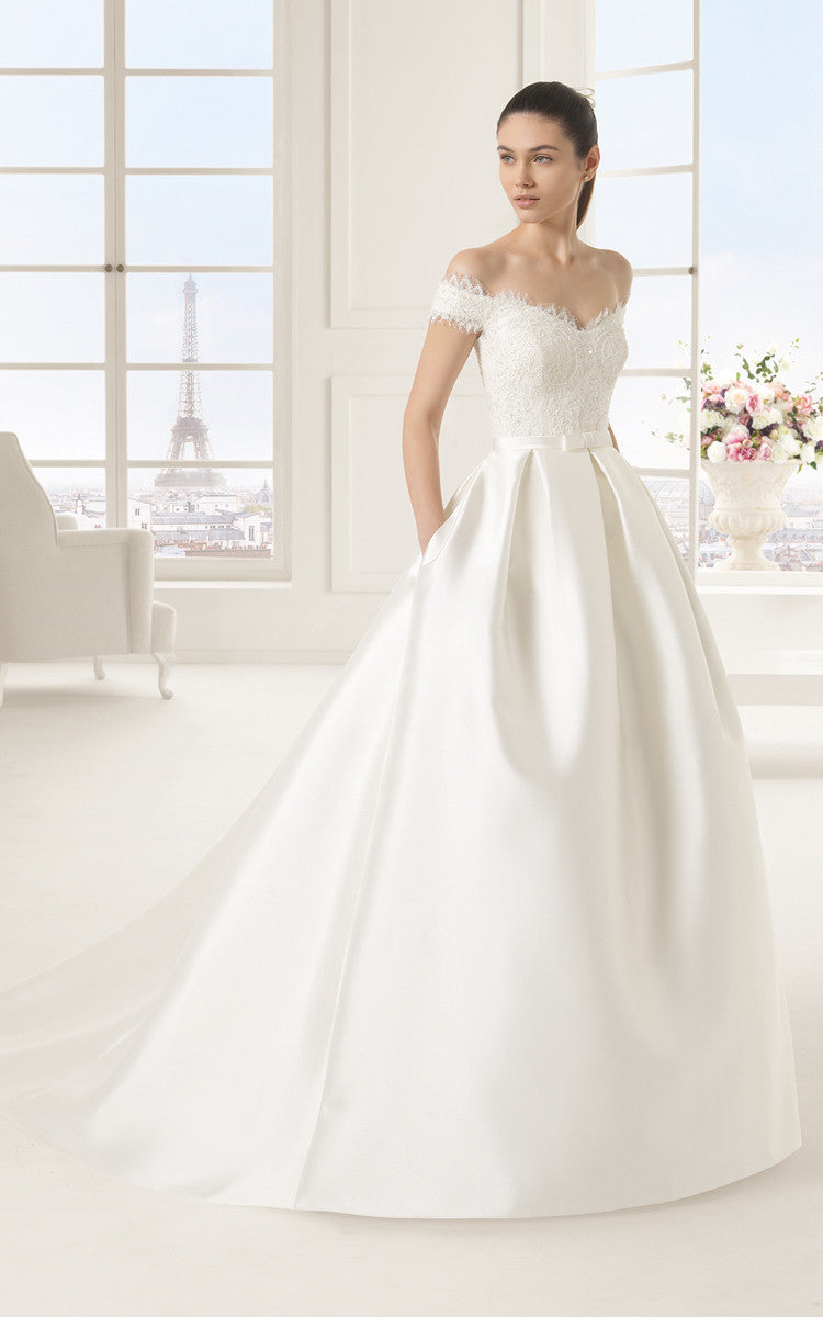 Princess Style Off-shoulder Lacy Bodice Satin Gown With Bow and Pockets-704089
