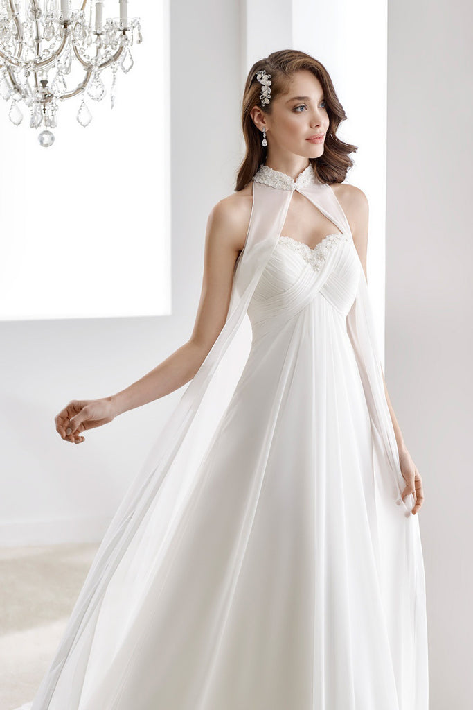 The Romantic Flowy Draping Chiffon A-Line High Neck Sweetheart Empire Wedding Dress with Beaded Detail is the yin, to your yang. You've found what you're looking for.