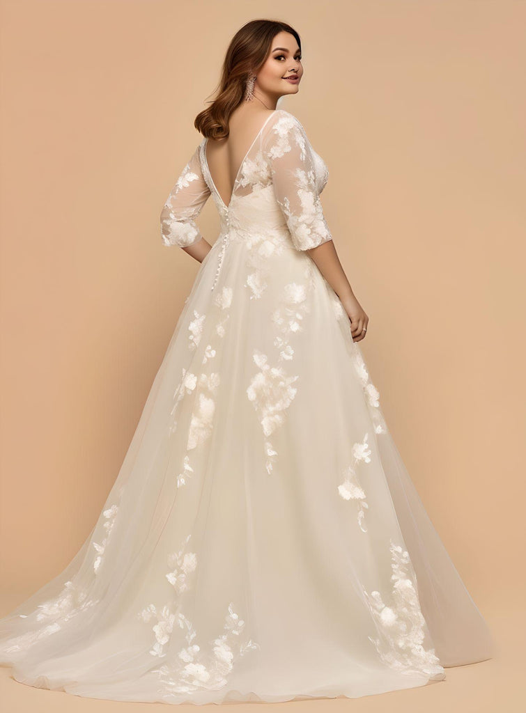 Romantic Plus Size A-Line V-neck Tulle Floor-length Wedding Dress Country Garden Simple Elegant 3/4 Length Sleeve-MW_760003
