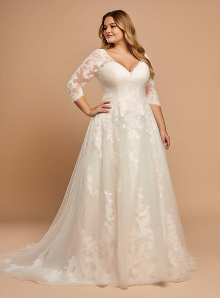 Every product is unique, just like you. If you're looking for a product that fits the mold of your life, the Romantic Plus Size A-Line V-neck Tulle Floor-length Wedding Dress Country Garden Simple Elegant 3/4 Length Sleeve-MW_760003 is for you.