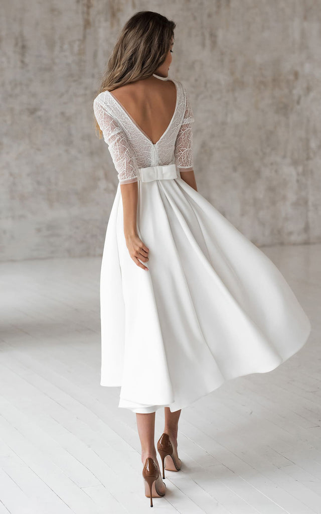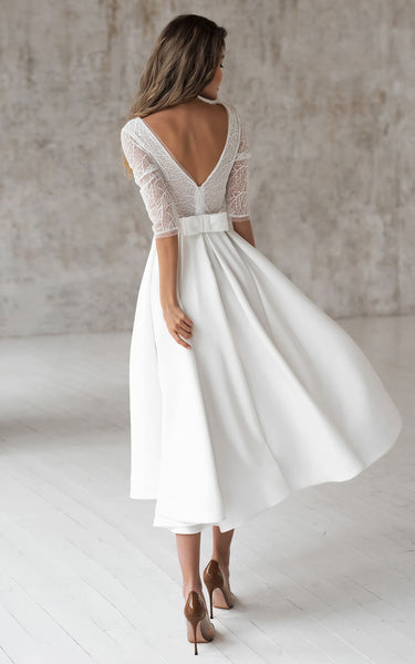 Romantic Satin V-neck A Line Tea-length Wedding Dress with Ruching and Sash
