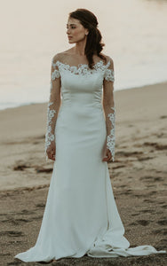 The Satin Sheath Off-the-shoulder Casual Beach Wedding Dress With Appliques And Illusion Back-716581 is the yin, to your yang. You've found what you're looking for.