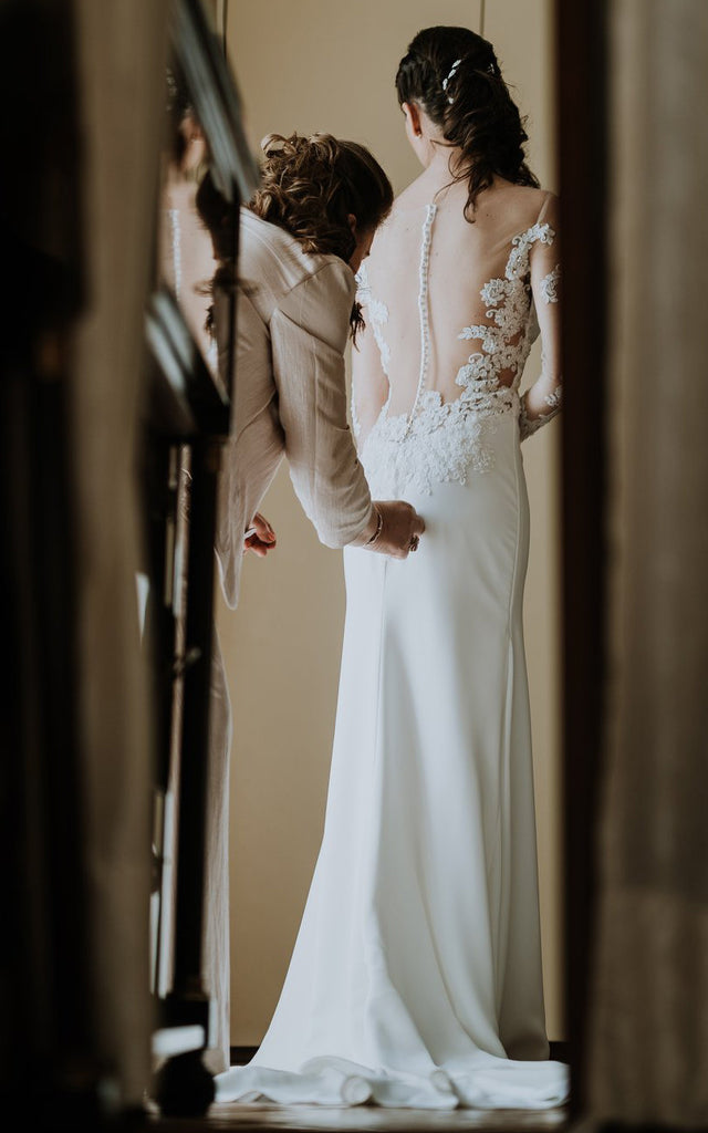 Satin Sheath Off-the-shoulder Casual Beach Wedding Dress With Appliques And Illusion Back-716581