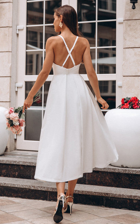 The Satin Tea-length A Line Sleeveless Simple Wedding Dress with Ruffles-716015 destined to impress, and priced at only $134.59, for a limited time.