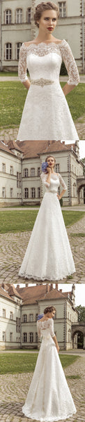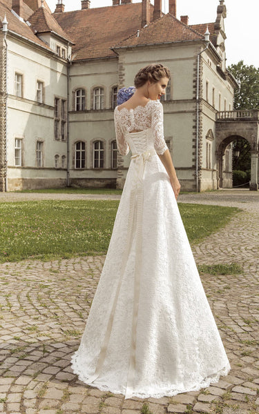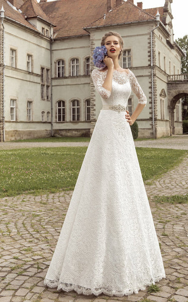 Scalloped Neckline Half Sleeve Floor-length A-line Lace-up Dress With Crystal Detailing-714071