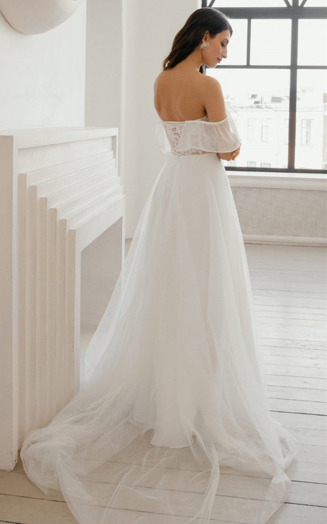 Sexy Off the Shoulder A Line Tulle Sweetheart Sweep Train Wedding Dress with Split Front-716070