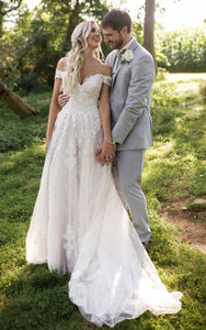Sexy Elegant A-Line Boho Off-the-Shoulder Wedding Dress with Lace Appliques and Sweep Train