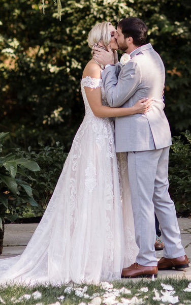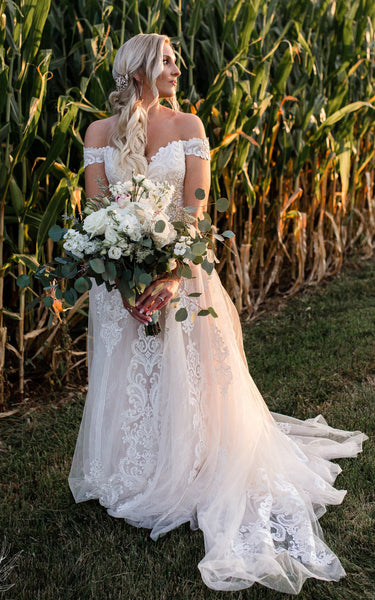 The Sexy Elegant A-Line Boho Off-the-Shoulder Wedding Dress with Lace Appliques and Sweep Train is a sensational customer favorite, and we hope you like it just as much.