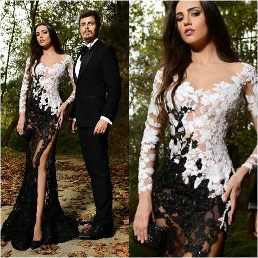 Sexy Lace Appliques Mermaid Prom Dress Evening Gown Front Split Black and White-319196