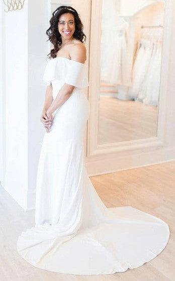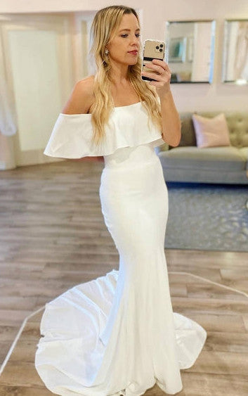 The Sexy Mermaid Satin Off-the-shoulder Wedding Dress With Open Back And Court Train-716555 is far and away, one of our most popular items. People can't seem to get enough of it.