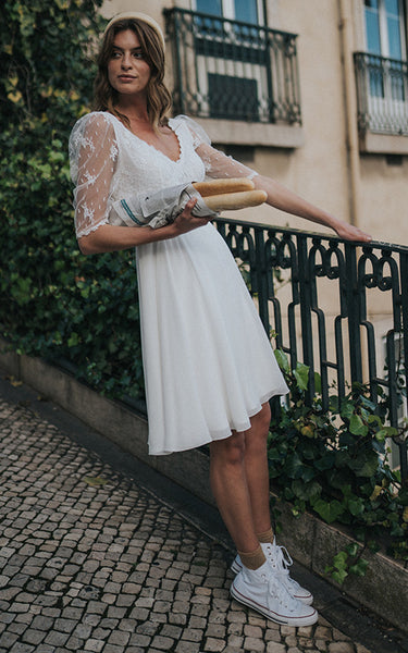 The Short Simple Casual A-Line Boho Lace Mini Wedding Dress Vintage Half Sleeves Illusion Back Scalloped Neckline Bridal Gown is far and away, one of our most popular items. People can't seem to get enough of it.
