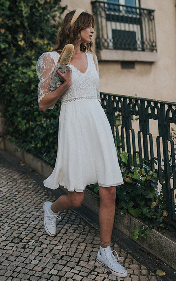 Short Simple Casual A-Line Boho Lace Mini Wedding Dress Vintage Half Sleeves Illusion Back Scalloped Neckline Bridal Gown