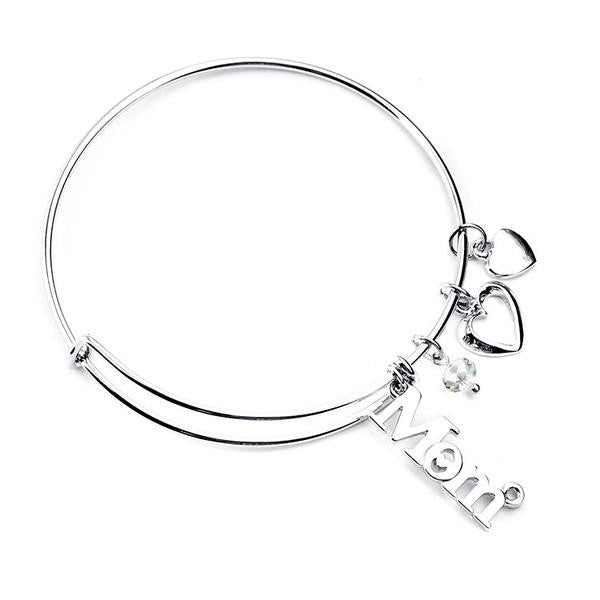 A Mother's love is timeless and unconditional, this charm bangle is a delicate gift of affection to show her just how much she means to you. She will be sure to cherish this thoughtful gift for many years to come. It is carefully detailed with 2 motif charms, a crystal pendant and a unique "Mom" charm, giving it a touch of sparkle and flare to match any outfit.