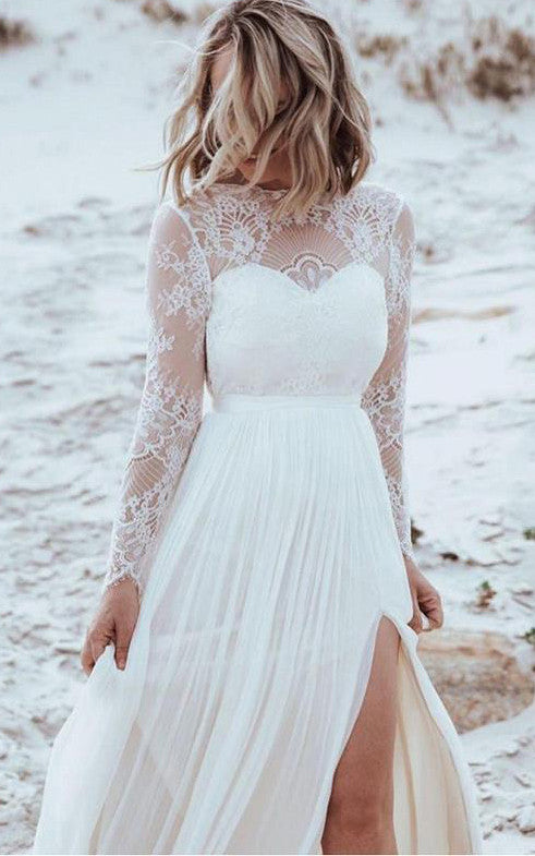 Simple A Line Bateau Tulle Lace Floor-length Long Sleeve Wedding Dress with Split Front and Pleats-715949