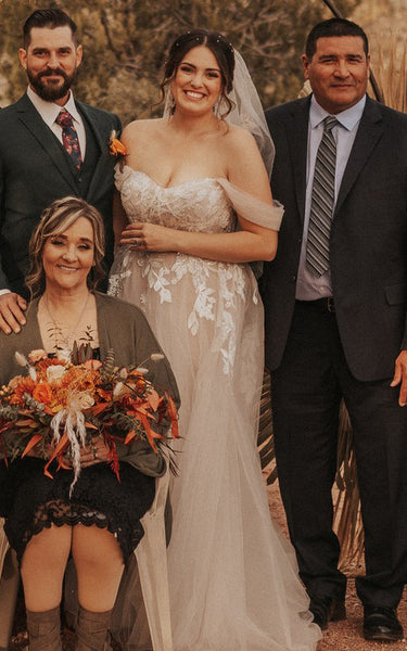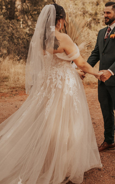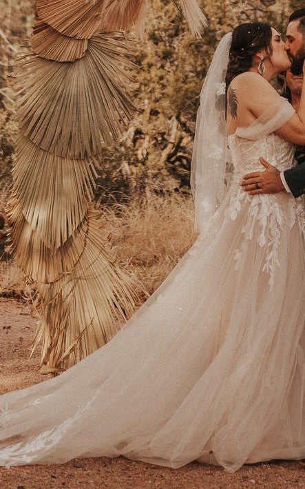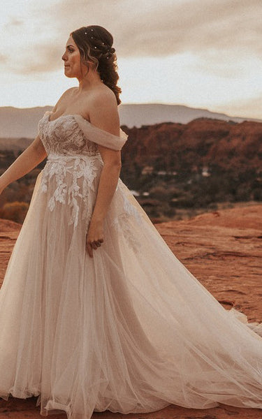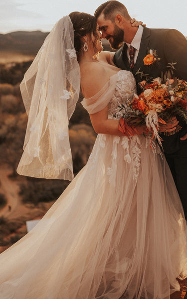 Simple A Line Off-the-shoulder Tulle Sleeveless Wedding Dress with Train Sexy Elegant Romantic Country Garden-716802