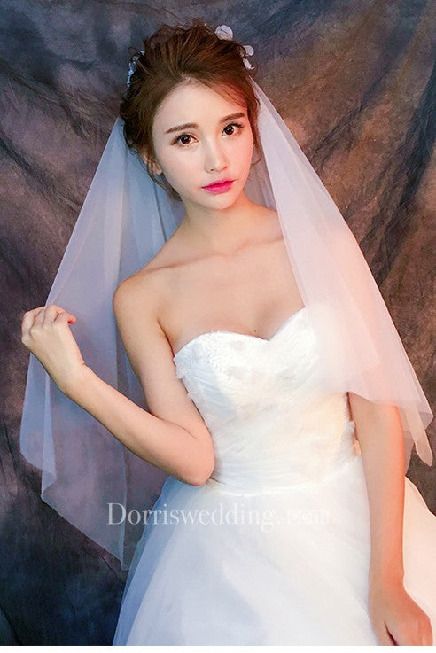 Simple Fingertip Short Tulle Wedding Veil with Flower Appliques