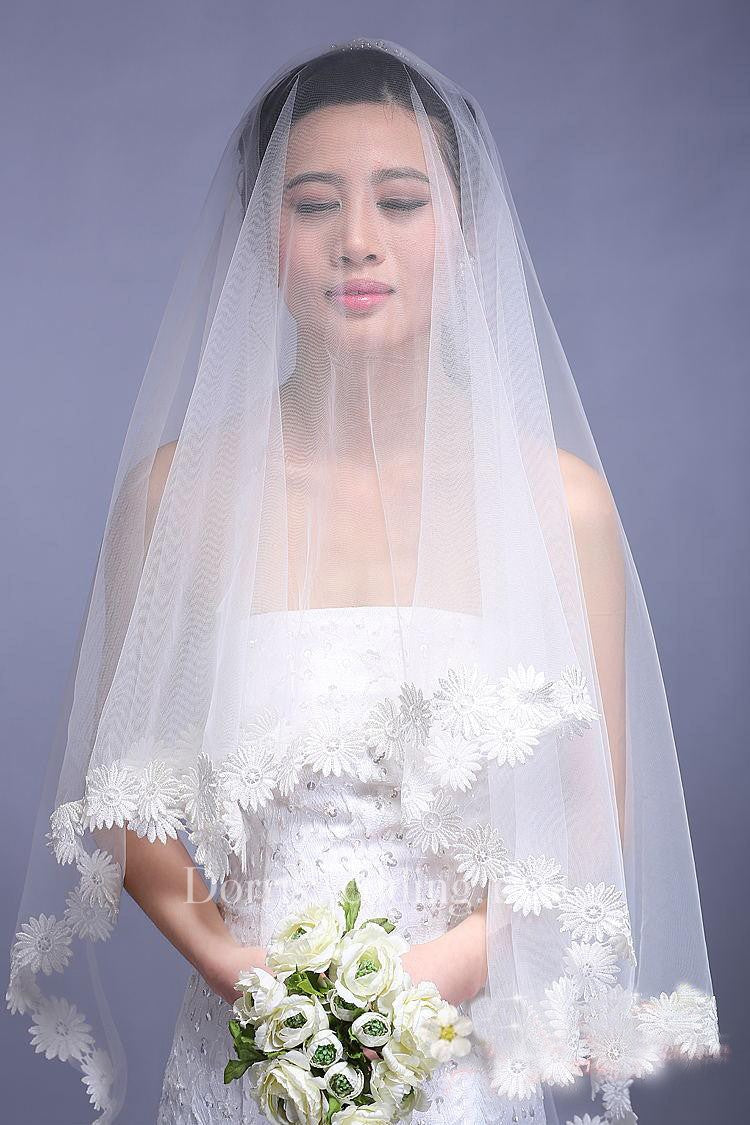 Simple Style Cathedral Long Wedding Veil with Flower Edge
