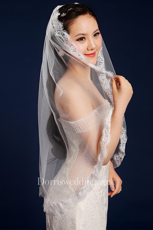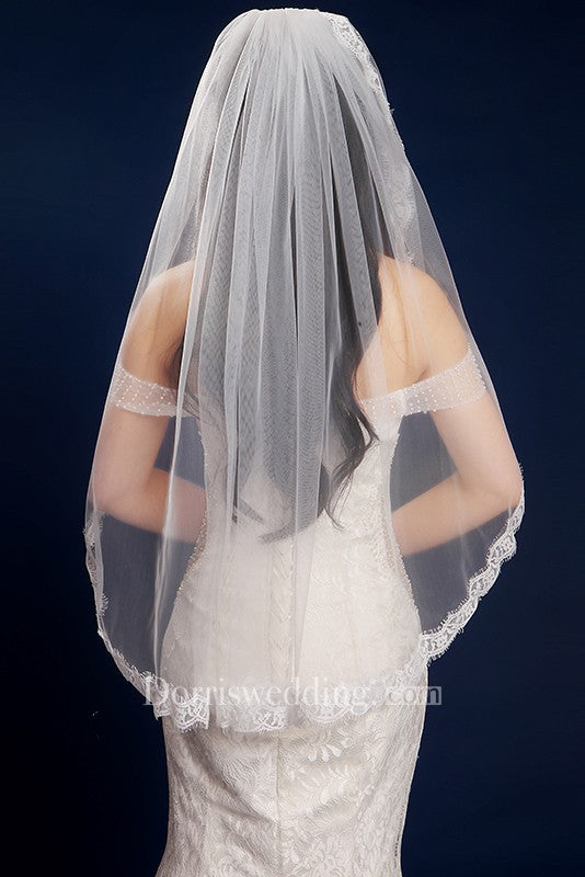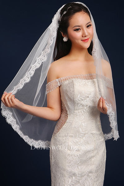 Simple Style Fingertip Short Tulle Wedding Veil with Lace Edge