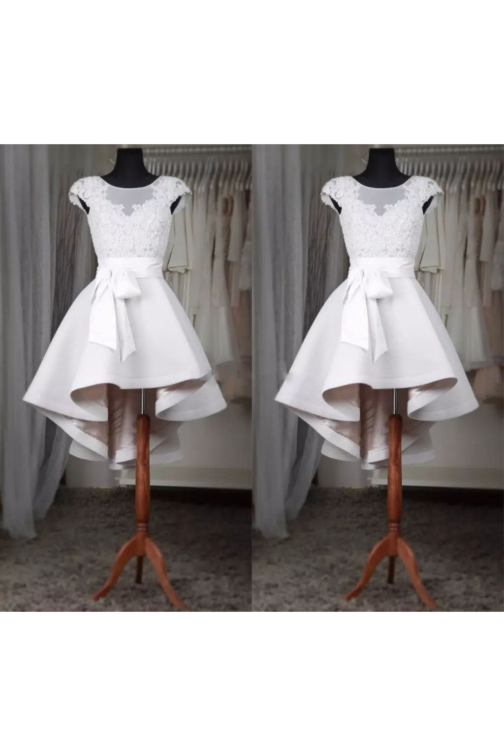 Square A-line High-low Short Sleeve Satin Wedding Dress with Zipper Back-715568