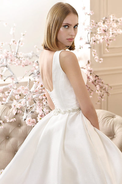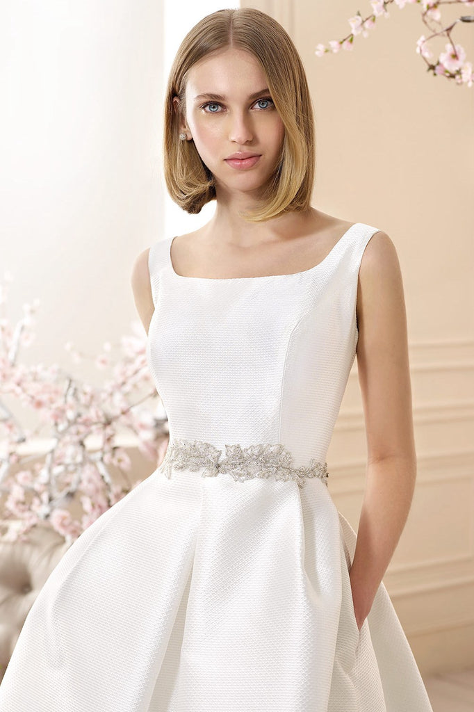 square-neck Sleeveless Satin A-line short Wedding Dress With Jeweled Waist-MK_705947