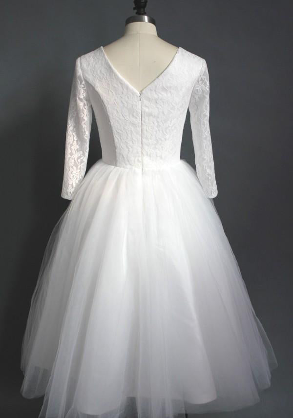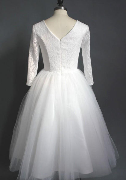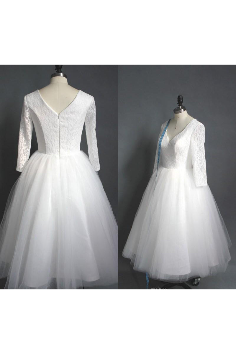Tea Length High Quality A-line V Neck Lace Top Tulle Wedding Dress-715357