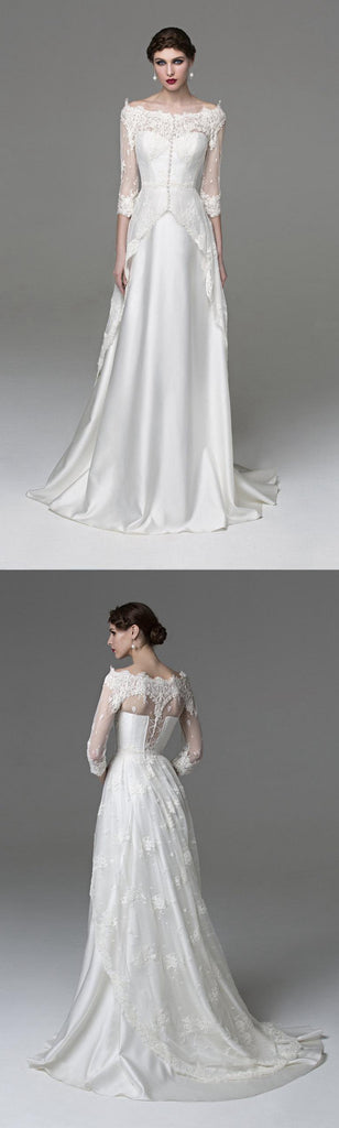 Unique Lace Overlaying Satin Wedding Dress With Bateau Neck-ET_711353